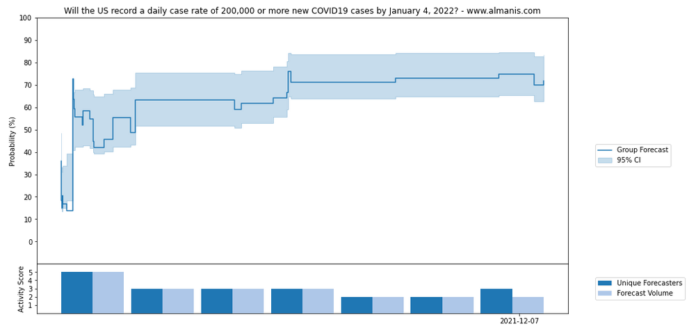 The graph above shows a time series of activity on the question: ‘Will the US record a daily case rate of 200,000 or more new COVID19 cases by January 4, 2022?’.