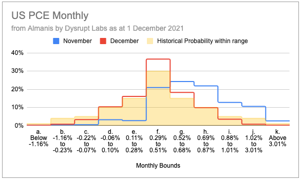 The probability density graph above shows the probabilities for two iterations of the question ‘What will be the month-to-month percentage change in Personal Consumption Expenditure?’ (November and December) at a specific time on 1 December 2021.